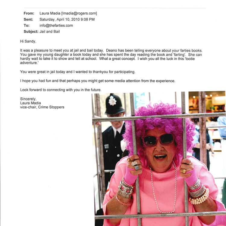 Thank goodness the wonderful people of Paris bailed out the Fartie Ladies and we didn’t have to spend too much time locked up. All in all it was a great cause and The Fartie Ladies read out book Meet the Farties and the judge just laughed and laughed, he finally said if he couldn’t stop laughing he would have to let us go. I guess he really enjoyed the giggles and he must be laughing to this day because we are free!