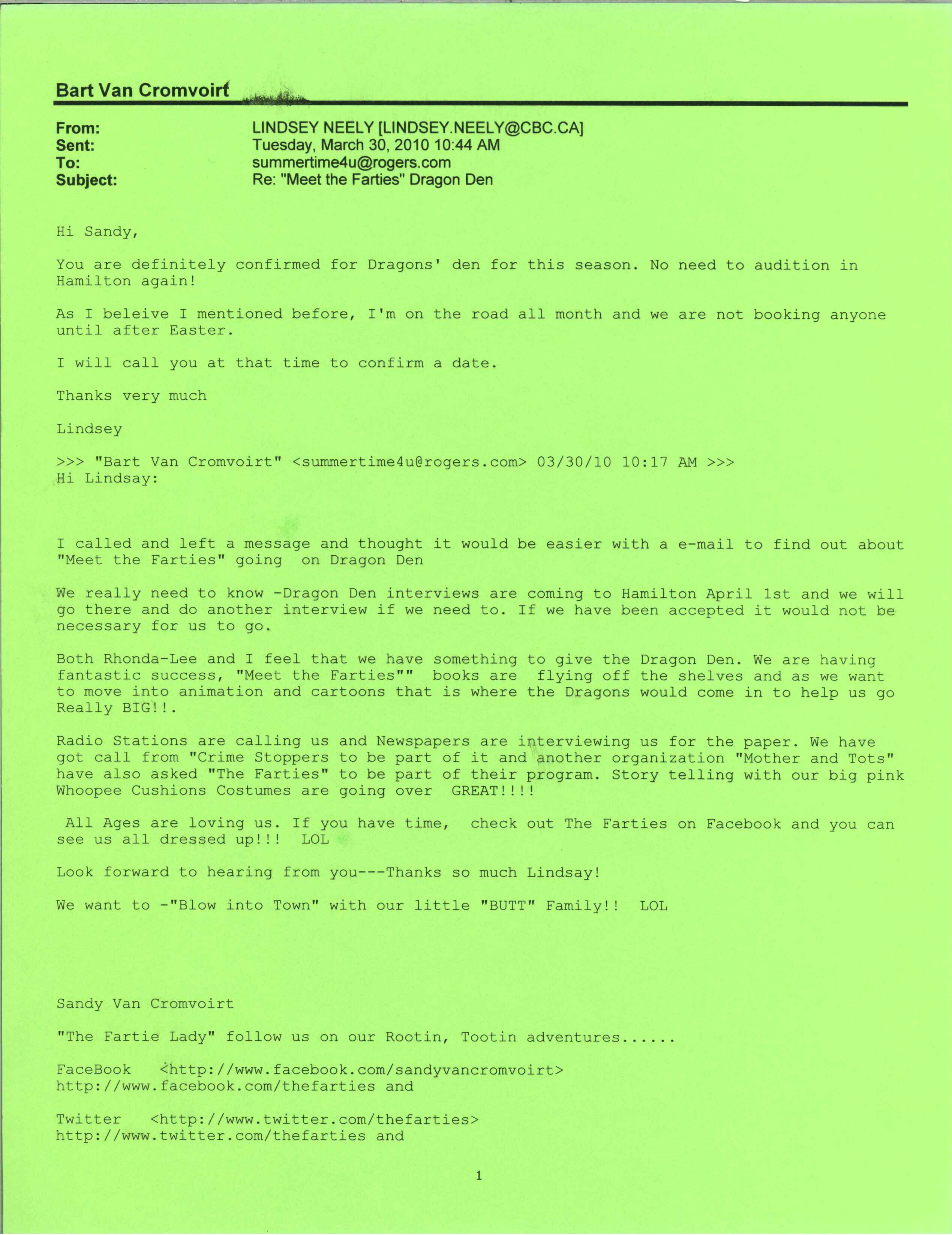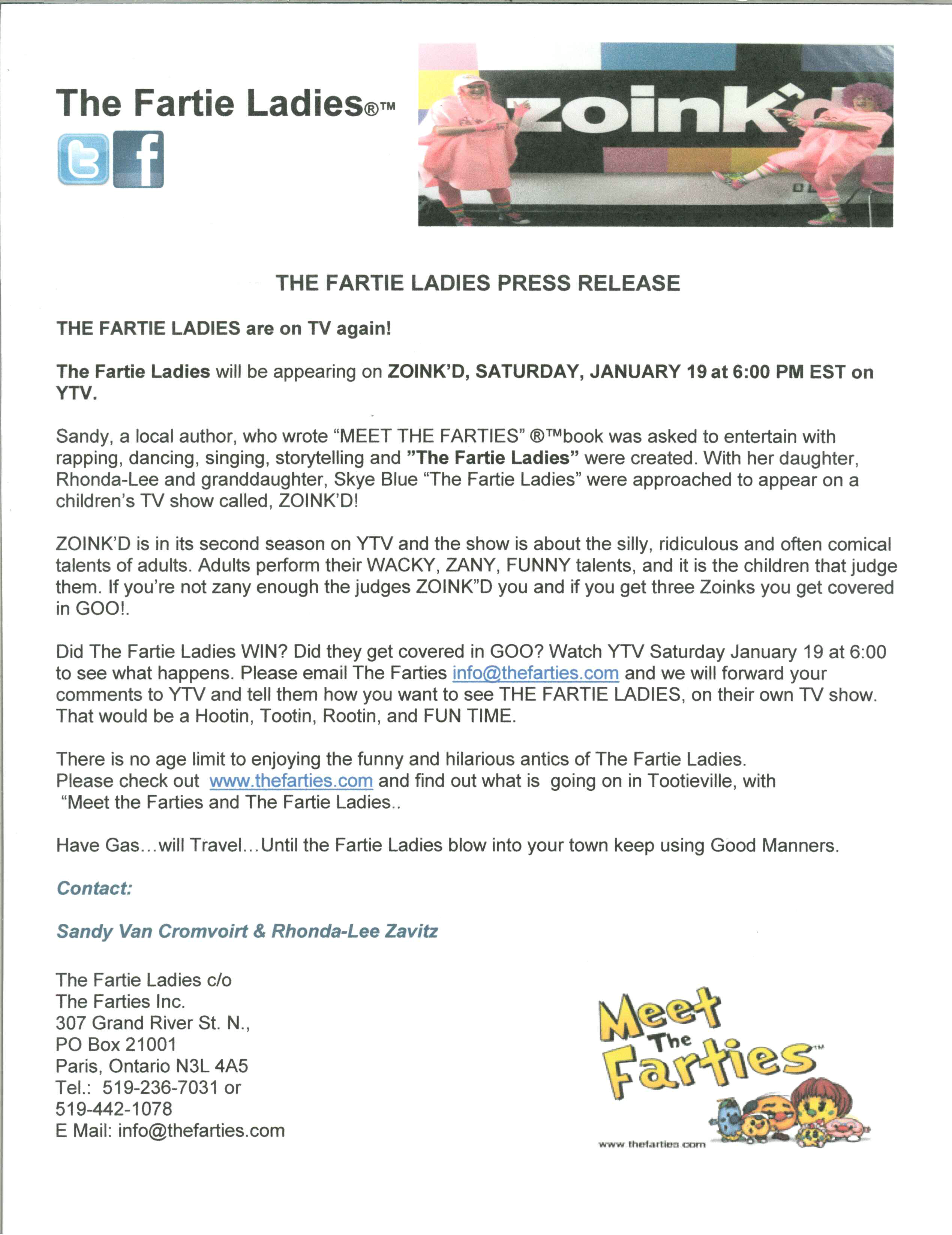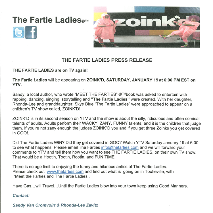 We arrived in Toronto to taped our appearance on Zoink’d. Zoink'd was a YTV production in Toronto. The show was about adults performing for kid judges who weigh in on the “silly, ridiculous and often comical talents” of adults. The flatulence-loving, well-mannered Fartie Ladies are the Authors of "The Fartie Series" and along with the Fartie books have also written their own songs to go with the family of cartoon talking "BUTTS:..and their gassy adventures.. The Fartie Ladies were at a bit of a disadvantage as the third member of The Fartie Ladies, wasn’t allowed to perform with them because she was too young....the show was for adults' only The Fartie Ladies landed a spot on Zoink’d thanks to Lindsay Neeley, an assistant producer on Dragon’s Den when they appeared on that show in 2010. “She just loved us,” Van Cromvoirt said. “She really gets our message of good manners in a fun way.” That connection paid off when Neeley asked show host and comedian Adam Christie to interview the youngest member of the Fartie Ladies that came with the family to cheer us on. It was great that "Honey" of the Fartie Ladies got to be part of the show, The Fartie Ladies came in second to a magician who used doves in his act. “As soon as I saw those doves, I knew we were in trouble,” Funny said of The Fartie Ladies.. “A lot of folks young and older really think "The Farties" need their own TV show,” . “We would hit all ages. There would be no barriers … Everybody has gas.” Lets blow this out of the water and really help reduce STRESS...
