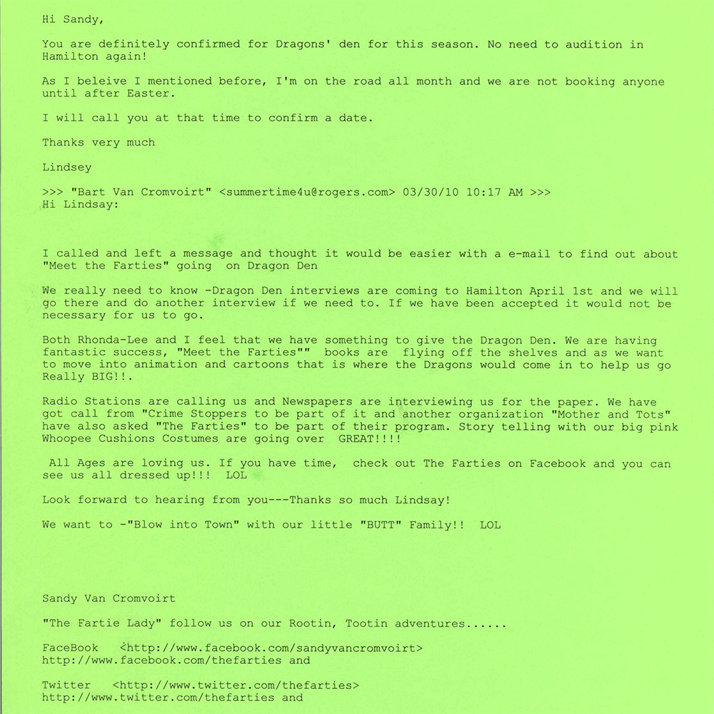 The Fartie Ladies' all dressed up in our signature Big Pink Whoppee Costumes had been on "DRAGON DEN"...Everyone had a good laugh about our book "Meet the Farties" and our fuuny song and presentation.